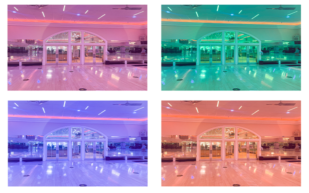 Enjoy our 42" disco ball with GOBO lights, ribbon light strips and horizontal wall strip lighting installed by Lindsey Glass and In Motion Engineering.